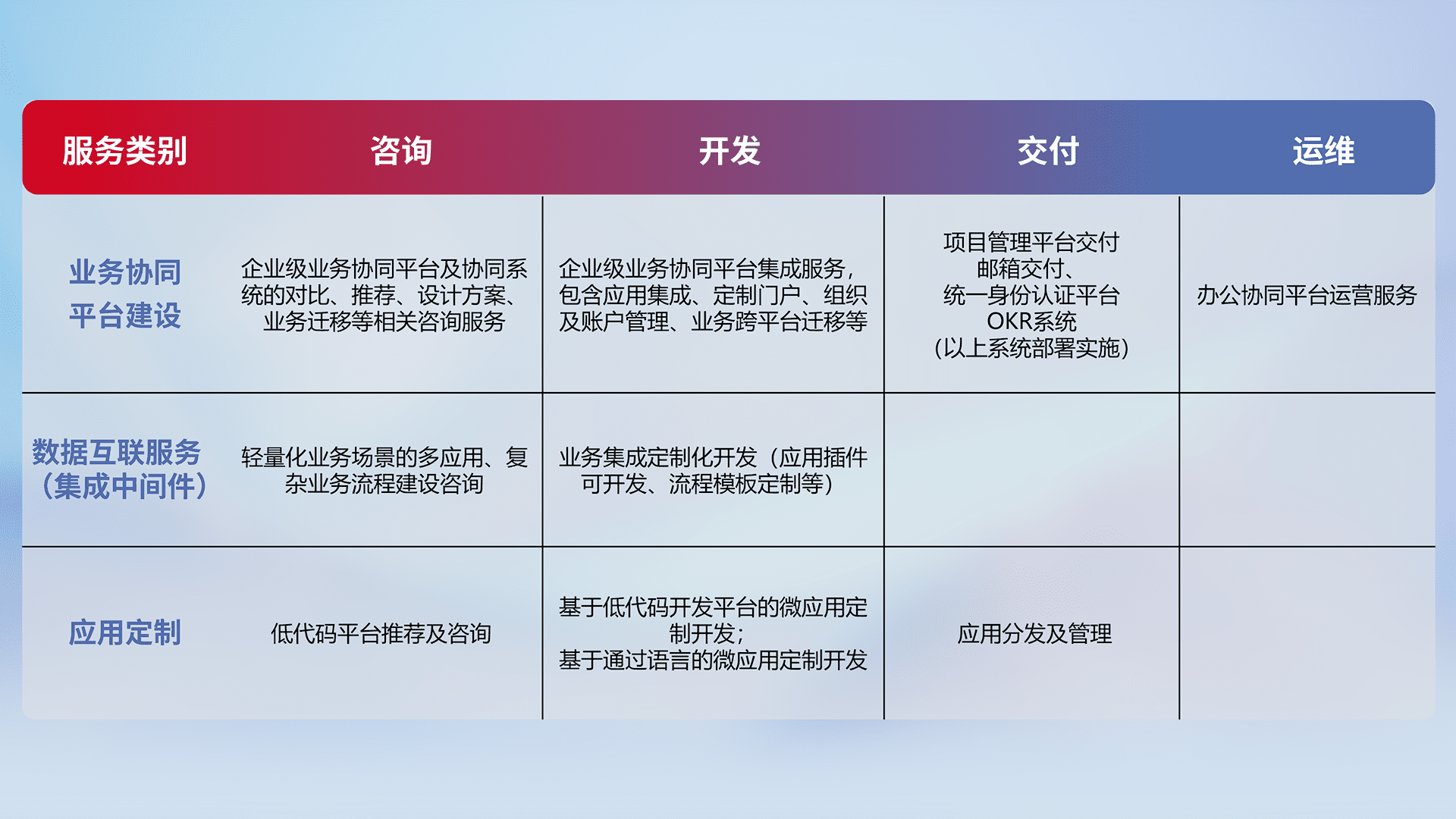 针对钉钉、、、、企微、、、、IDaas等平台级产品提供产品的规划、、方案、、、、交付、、、定制化开发等服务,,实现如统一协同办公、、、智能客户服务、、混合会议管理、、、智能数据查询、、、、等业务场景,,实现数字化转型。。。